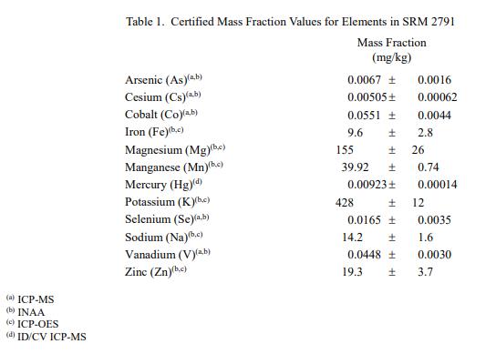 表 1 提供了 SRM 2791 中元素的認證質量分數值,以干質量為基礎報告。NIST 認證值是 NIST 對其準確性有最高置信度的值,在所有已知的或懷疑的偏倚來源已被調查或考慮[1]。 NIST 進行了賦值分析。元素的認證質量分數值計算為平均值