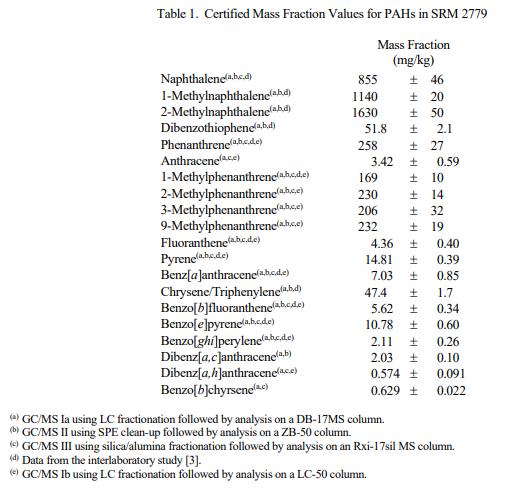 表 1 中提供了 21 種 PAH 的認證質量分數值。NIST 認證值是 NIST 對其準確性有最高置信度的值,因為所有已知或可疑的偏差來源都已被調查或考慮在內帳戶 [1]。認證值基于以下協議在 NIST 使用多種分析技術獲得的結果。