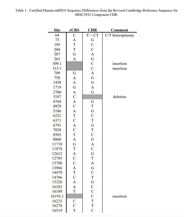 NIST 認證值是 NIST 對其準確性有最高置信度的值,因為 NIST 已調查或說明了所有已知或可疑的偏差來源。此 SRM 經認證可用于來自兩個類淋巴母細胞培養系(CHR 和 GM09947A)的整個人類 mtDNA(16 569 個堿基對)的序列以及包含 C-stretch 的 CHR 的克隆 HV1 區域。表 1 包含與 CHR 組件 [1] 的修訂劍橋參考序列 (rCRS) 的序列差異。表 2 包含組件 GM09947A 與 rCRS 的序列差異。表 3 包含成分 CHR 的克隆 HV1 區域與 rCRS 的序列差異。
