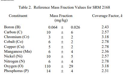 已知或可疑的偏倚來源已被調查或考慮 [2]。認證值是根據 NIST 和合作實驗室使用表 4 中所示測試方法進行的分析結果對真實值的當前最佳估計。