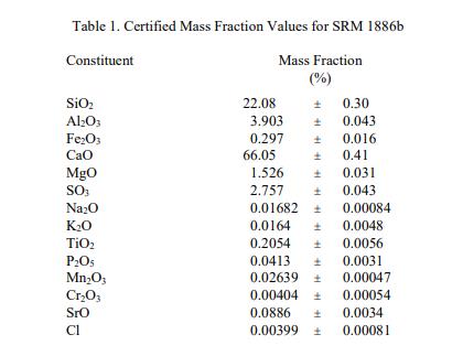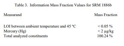 SRM 1886b 成分的認(rèn)證值在表 1 中報告為收到時的質(zhì)量分?jǐn)?shù) [1]。 NIST 認(rèn)證值是 NIST 對其準(zhǔn)確性具有最高置信度的值,因為所有已知或可疑的偏差來源都已被調(diào)查或考慮在內(nèi) [2]。認(rèn)證值是對真實值的當(dāng)前最佳估計。