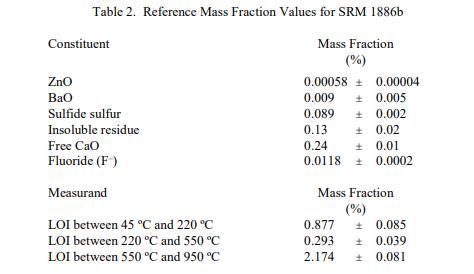 表 2 中報告了成分和燒失量 (LOI) 的參考值。NIST 參考值是未經(jīng)認(rèn)證的值,是基于可用數(shù)據(jù)對真實值的當(dāng)前最佳估計;但是,該值不符合 NIST 認(rèn)證標(biāo)準(zhǔn),并提供了相關(guān)的可能僅反映測量重現(xiàn)性的不確定性,可能不包括所有不確定性來源,或可能反映多種分析方法之間缺乏足夠的統(tǒng)計一致性 [2]。