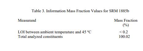 表 3 中報告了環境溫度和 45 oC 之間的 LOI 信息值和總分析成分。信息值被認為是 SRM 用戶可能感興趣的值,但沒有足夠的信息可用于評估與值相關的不確定性 [3]。