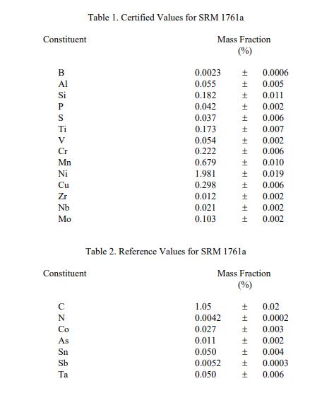 SRM 1761a 的值分配基于此 SRM 與原始 SRM 1761 的完整、高精度比較。SRM 1761a 的材料被證明與所有元素的原始材料沒(méi)有區(qū)別,除了 C、N 和 V . SRM 1761a 的賦值被認(rèn)為可以直接追溯到用于 SRM 1761 賦值的主要參考物質(zhì)和校準(zhǔn)。C 和 N 的賦值是使用基于 SRM 1761 的校準(zhǔn)通過(guò)燃燒和紅外檢測(cè)獲得的。V 的賦值是通過(guò) X 射線熒光光譜法獲得的基于低合金鋼 SRM 1761 至 1768 的校準(zhǔn)。在此證書中列出了賦值中采用的測(cè)試方法。