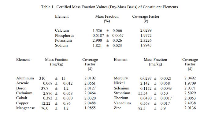 表 1 中提供了以干質(zhì)量為基礎(chǔ)報告的選定組成元素的認證質(zhì)量分數(shù)值。NIST 認證值是 NIST 對其準確性有最高置信度的值,在所有已知或已調(diào)查或考慮了可疑的偏見來源帳戶 [1]。