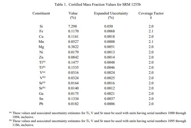 NIST SRM 1255b - 鋁合金356(圓盤形) 中成分的認(rèn)證值列在表 1 中,作為鋁基體中元素總量的質(zhì)量分?jǐn)?shù) [1]。 NIST 認(rèn)證值是 NIST 對(duì)其準(zhǔn)確性有最高置信度的值,因?yàn)樗幸阎蚩梢傻钠顏碓炊家芽紤]在內(nèi)。認(rèn)證值是對(duì)真實(shí)值的當(dāng)前最佳估計(jì)。認(rèn)證值在計(jì)量上可追溯至以百分比表示的 SI 派生的質(zhì)量分?jǐn)?shù)單位。每個(gè)規(guī)定的值是來自多個(gè)實(shí)驗(yàn)室的三種分析方法的結(jié)果的未加權(quán)平均值。隨數(shù)值列出的不確定度是擴(kuò)展的不確定度,使用列出的覆蓋因子 [3-5] 以大約 95% 的覆蓋率表示。